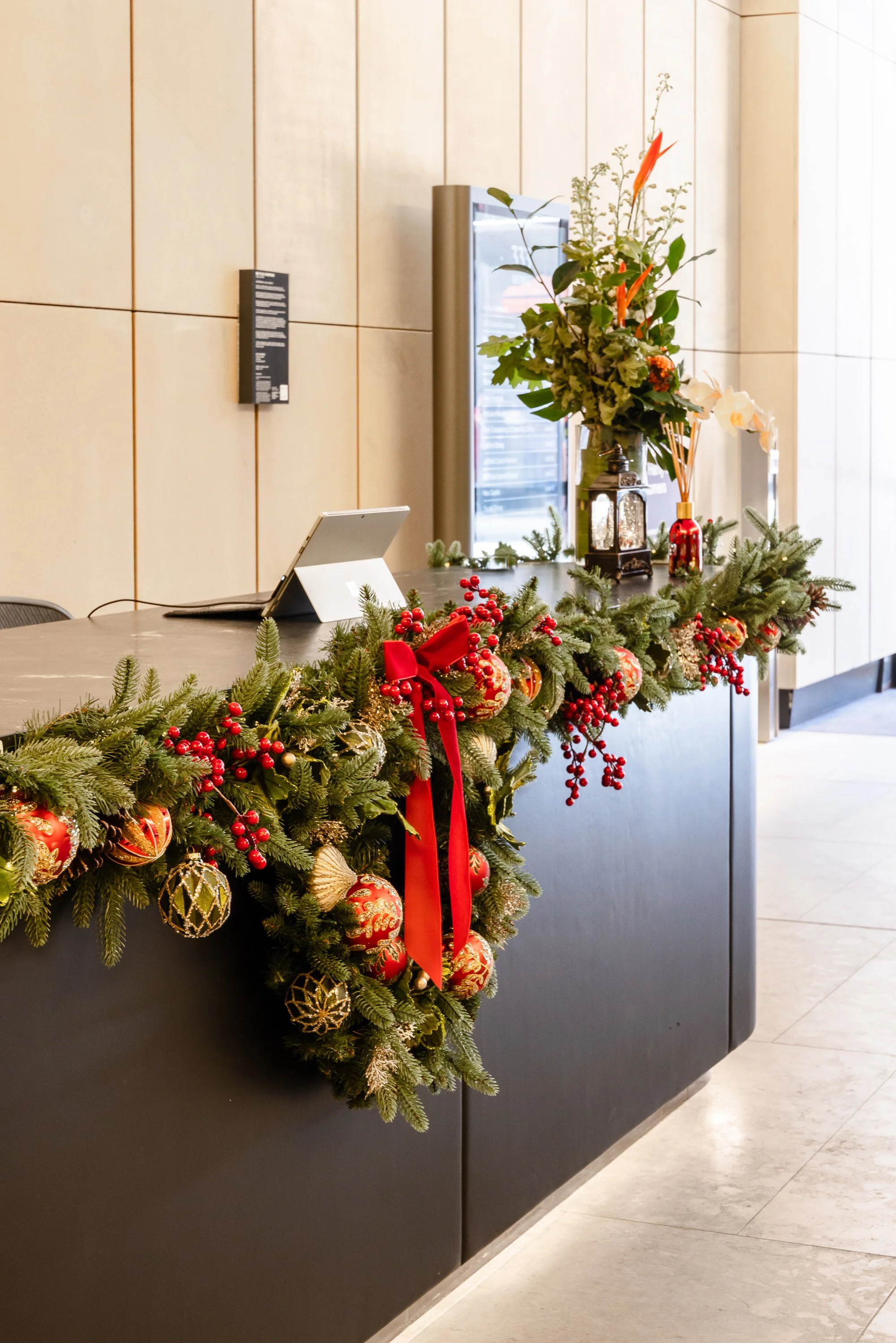 櫃台是迎賓焦點,室內可透過大量聖誕花條與各式花圈裝飾,也歡迎來圖訂製討論專屬聖誕花圈(條),也可以透過花圈與小型擺飾延續主題: